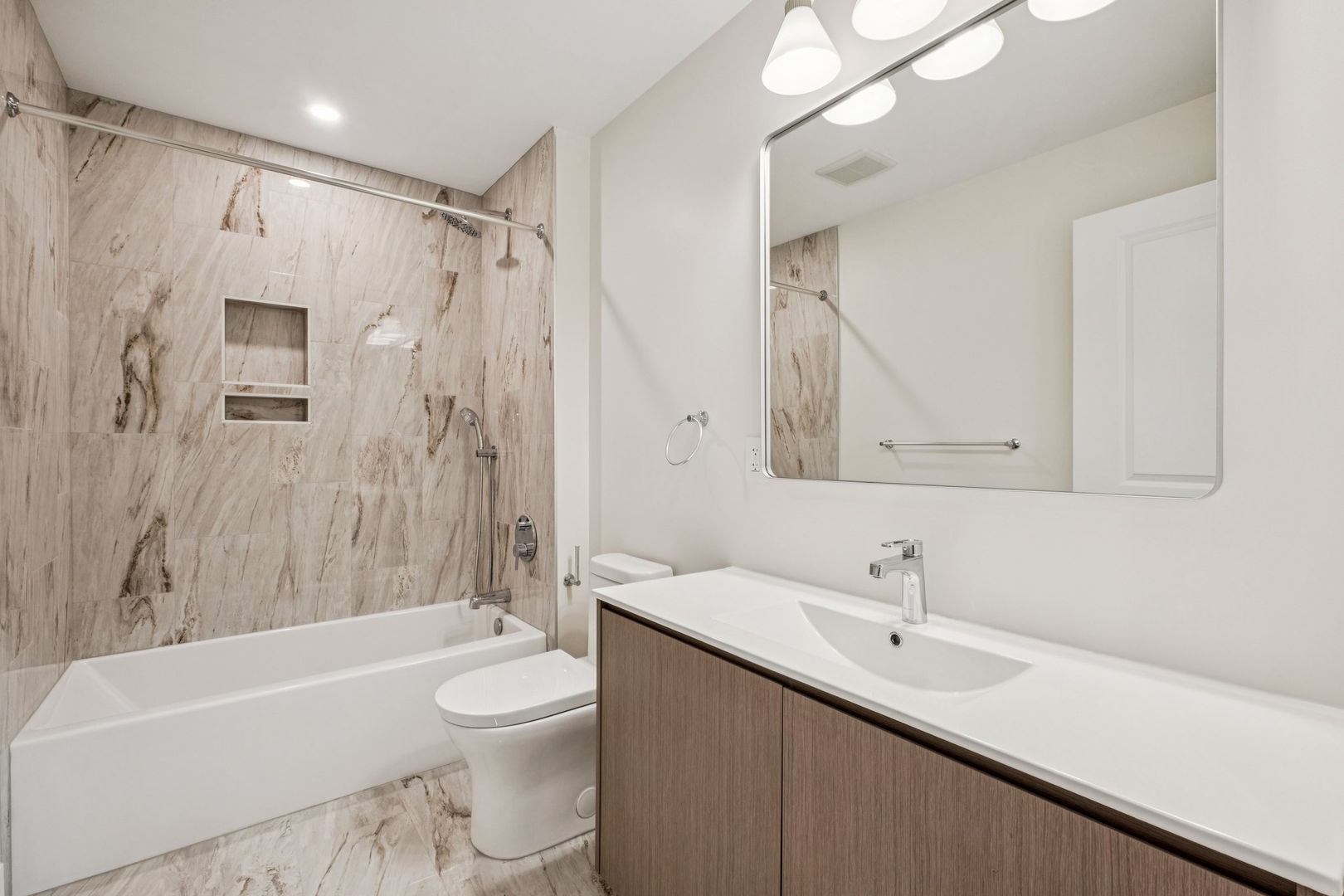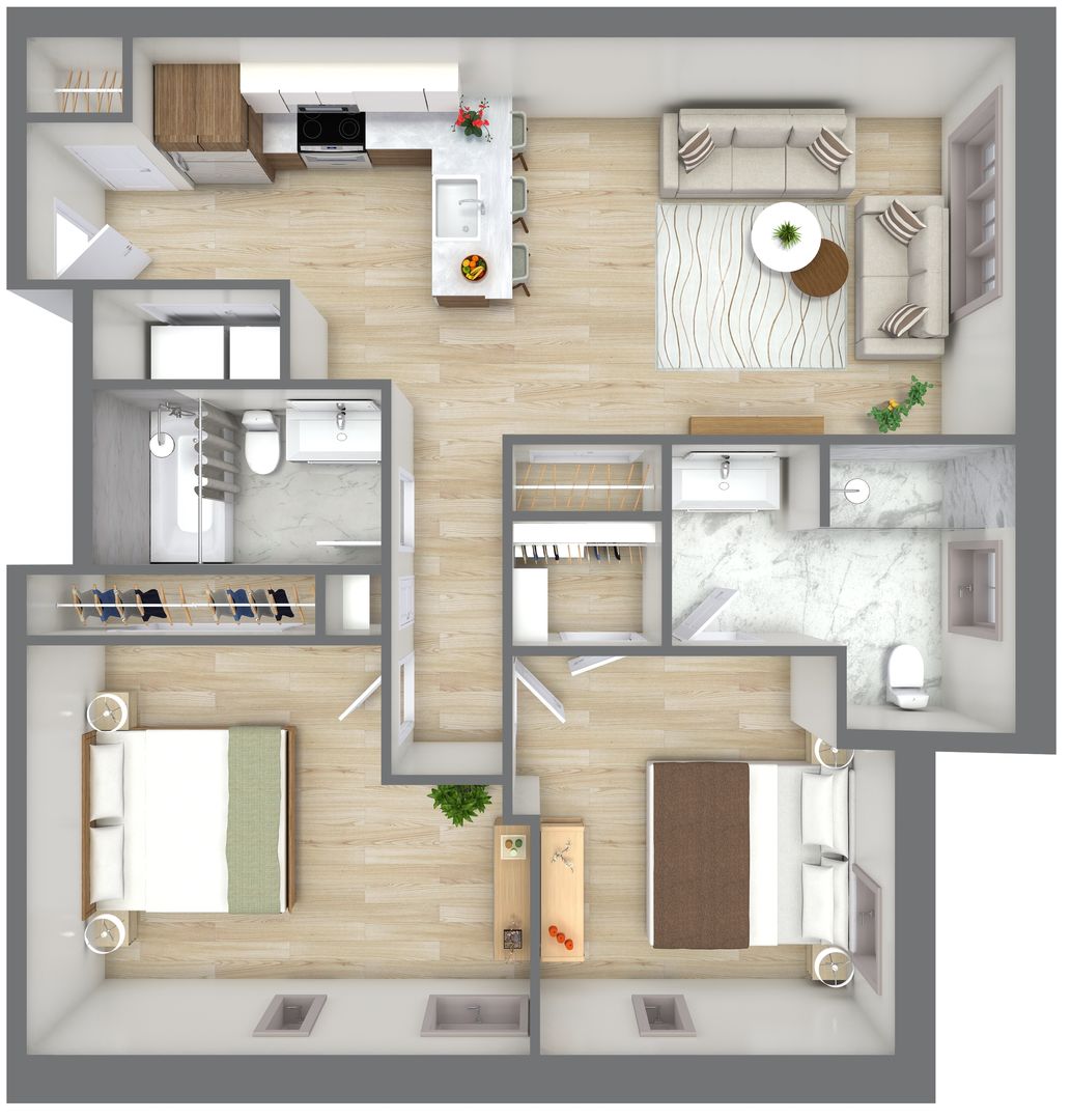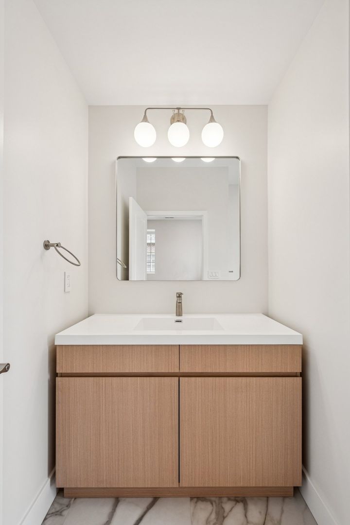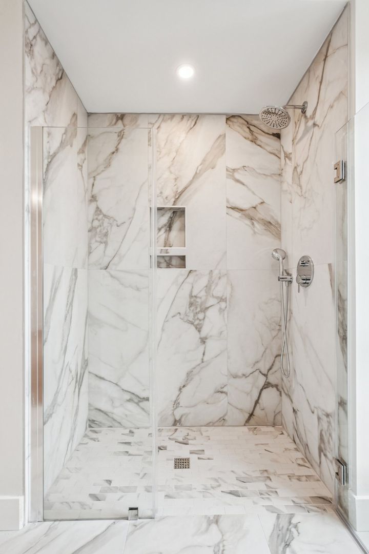 The primary bedroom suite features a custom closet, a luxurious private bath with Calacatta Gold-veined tile finishes, a brushed natural oak toned vanity and spacious standing shower. The second full bathroom showcases a bathtub with polished regal tile finishes and brushed grey toned vanity. Both bathrooms are adorned with an overhead showerhead and handheld shower providing ease of use and the luxury of a spa-like rain shower.