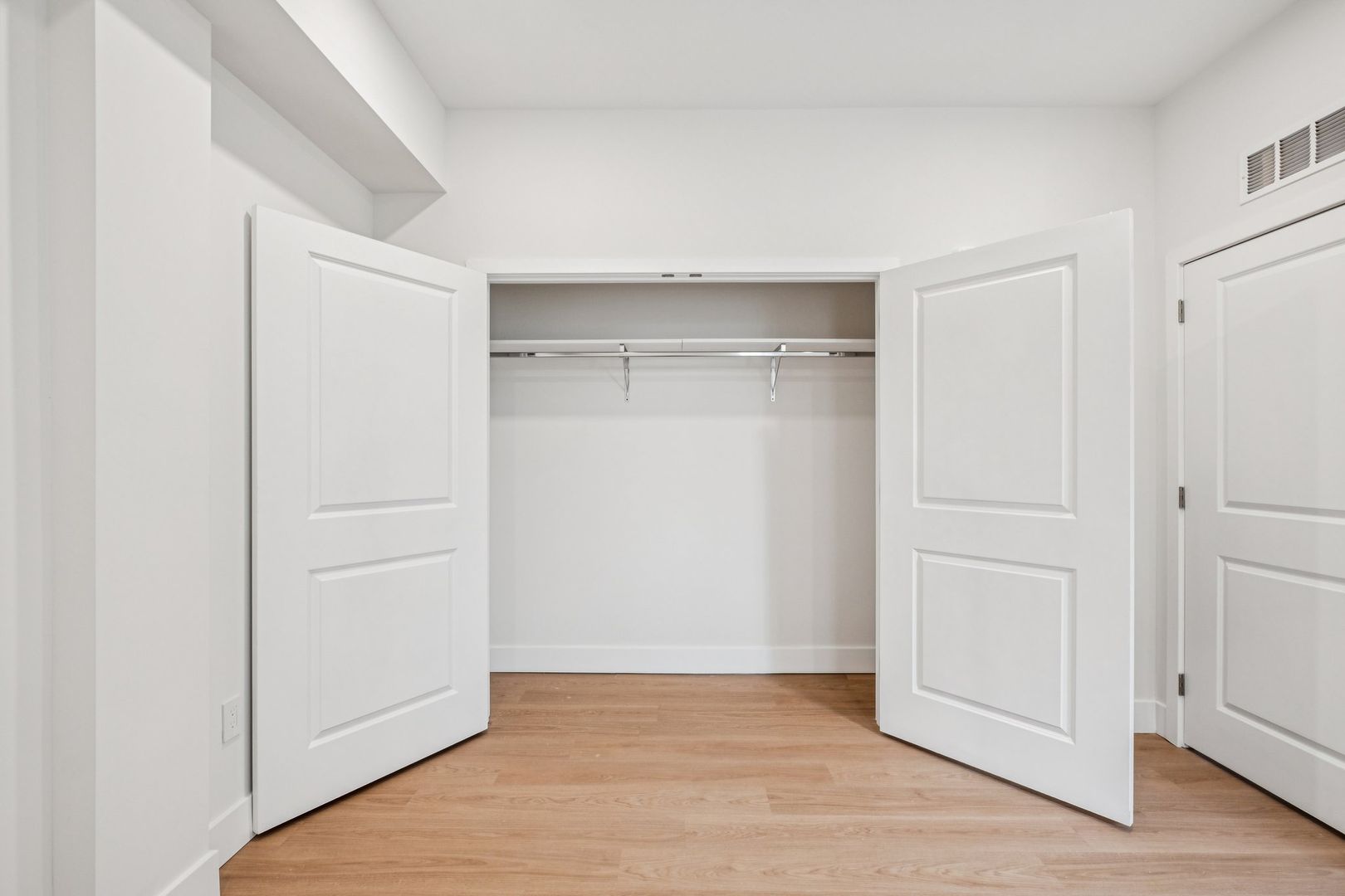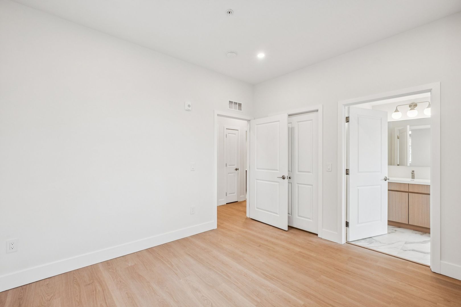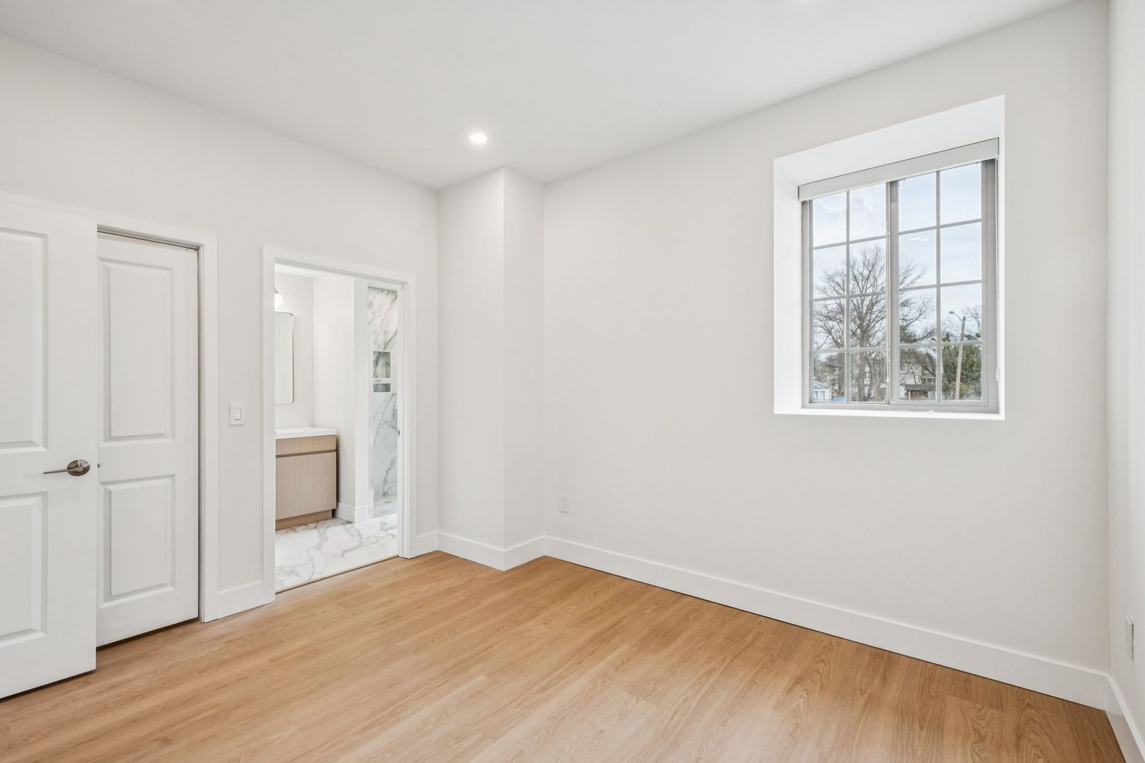 The primary bedroom suite features a custom closet, a luxurious private bath with Calacatta Gold-veined tile finishes, a brushed natural oak toned vanity and spacious standing shower. The second full bathroom showcases a bathtub with polished regal tile finishes and brushed grey toned vanity. Both bathrooms are adorned with an overhead showerhead and handheld shower providing ease of use and the luxury of a spa-like rain shower.