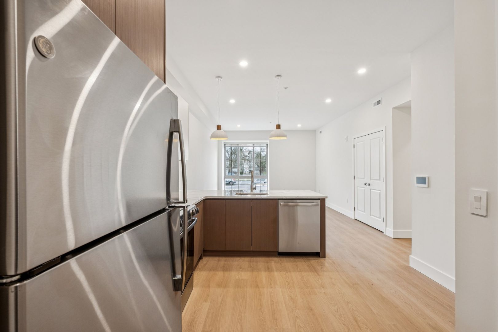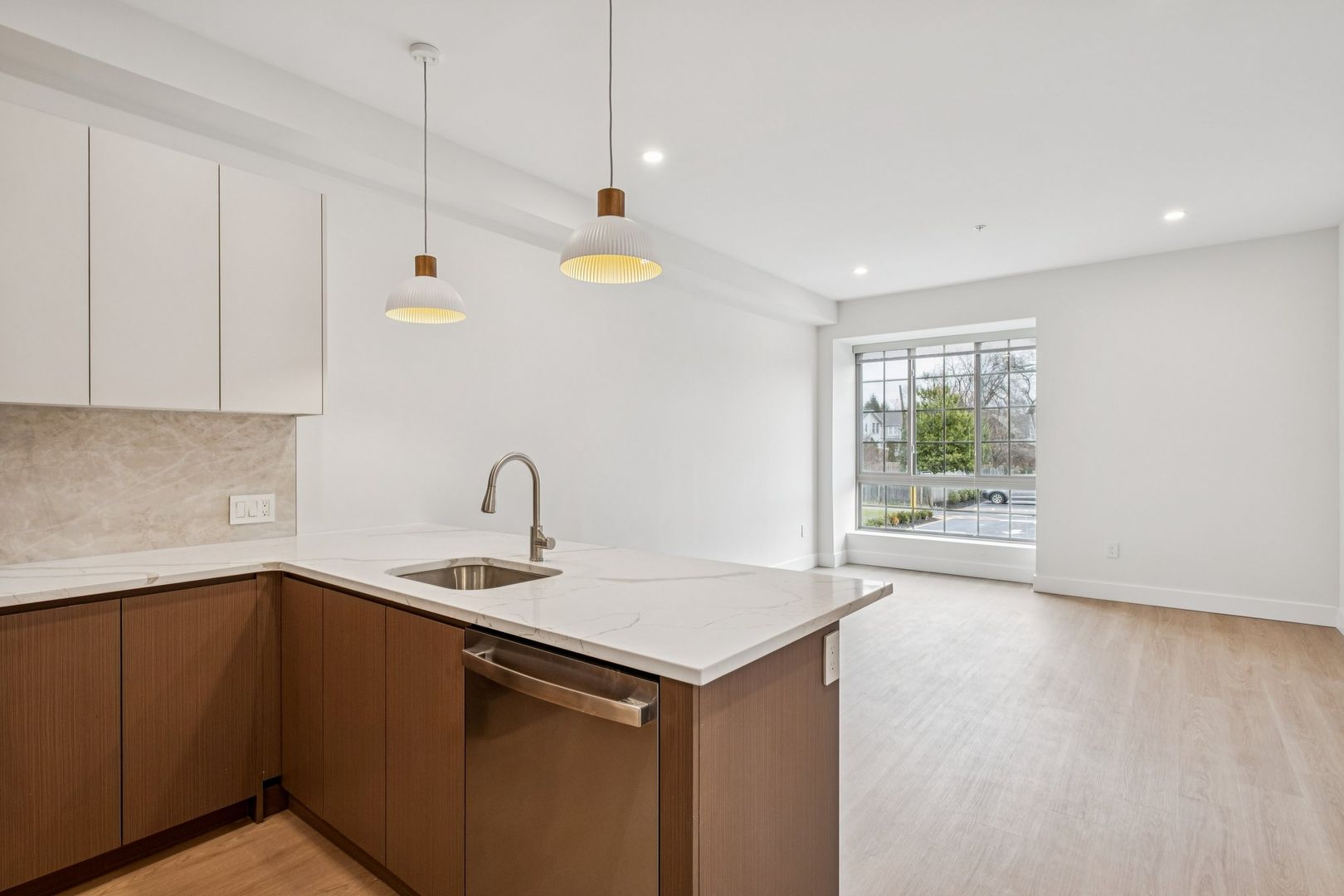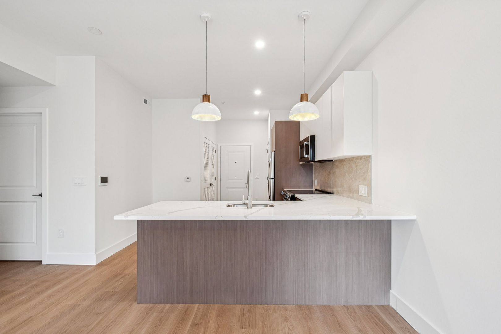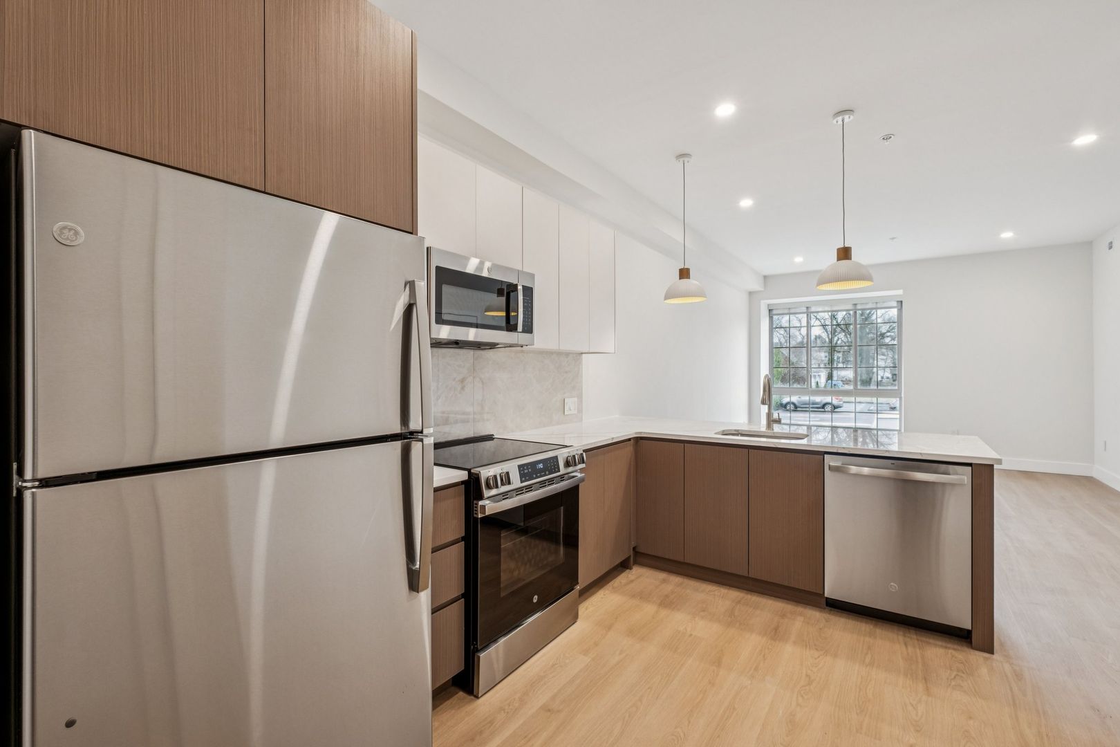 Welcome to the Sinclair at The Bellmere – Be the first to reside in this newly developed two-bedroom two-bathroom corner residence presenting an open layout, organic finishes, and beautifully sunlit interiors. With its curated design and tailored finishes, the residence delivers timeless two-tone walnut and ivory kitchen cabinetry and a eight-foot kitchen island lined with Pilazzo Gold quartz countertops. The kitchen showcases a full set of stainless-steel appliances and opens into a living room with architectural and grand windows.