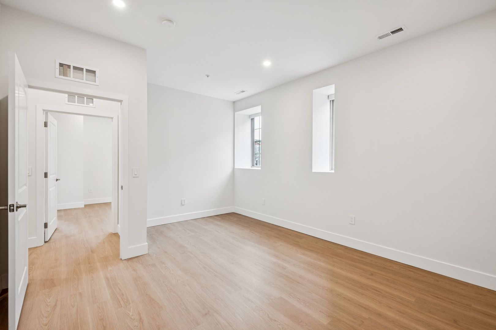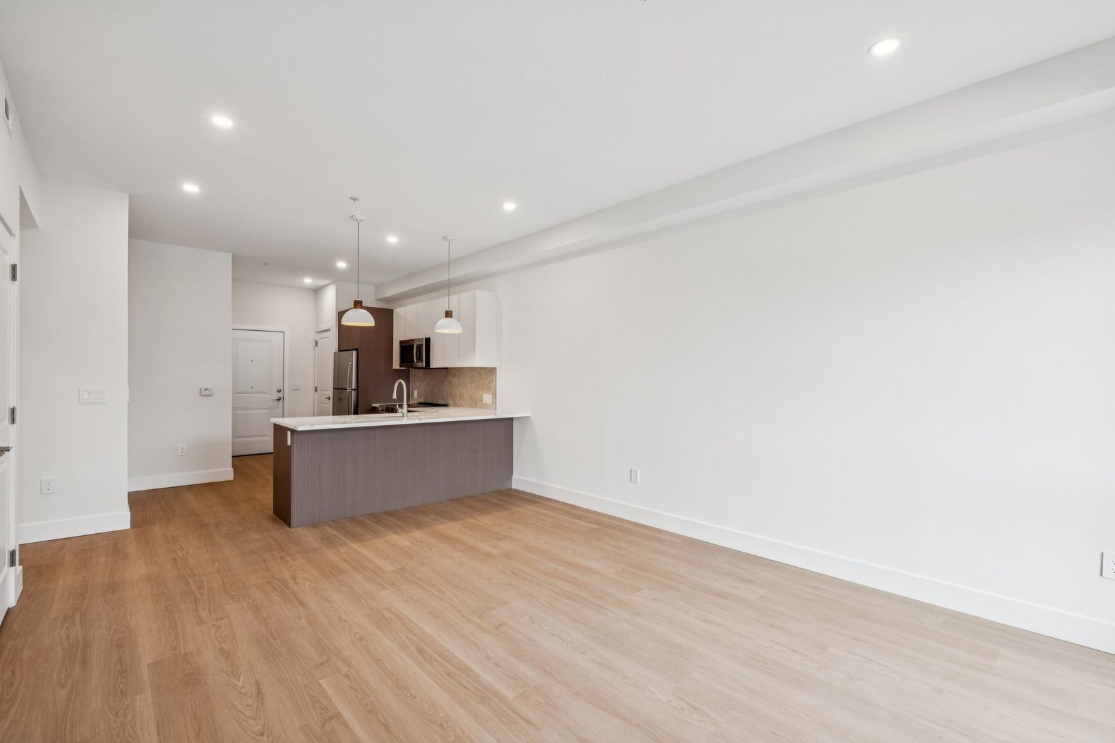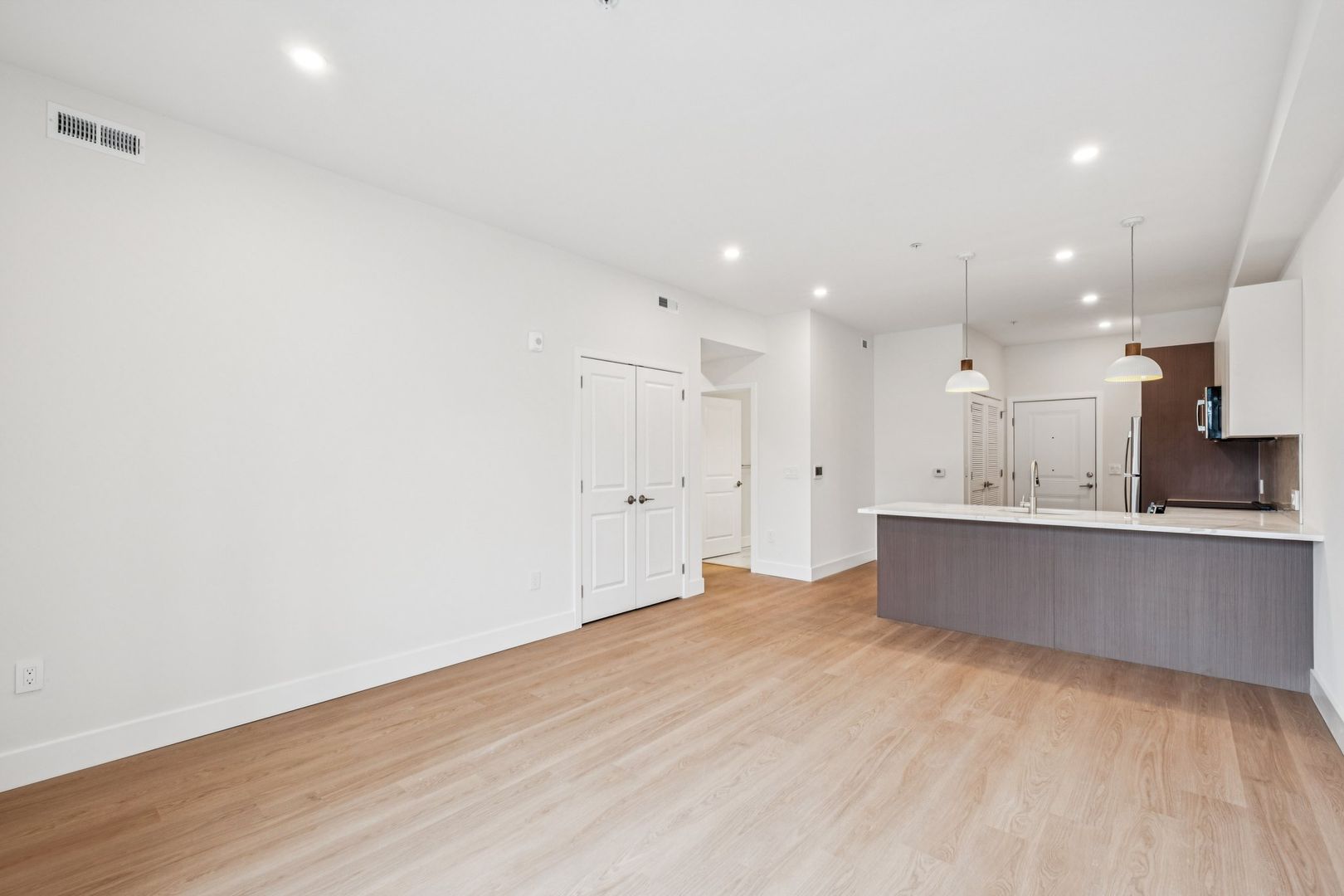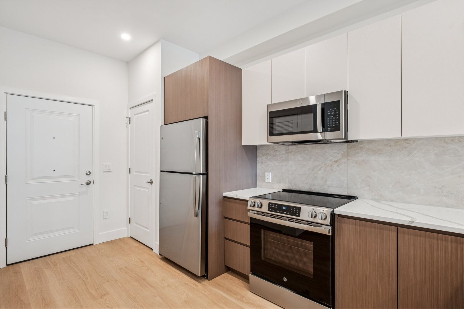 Welcome to the Sinclair at The Bellmere – Be the first to reside in this newly developed two-bedroom two-bathroom corner residence presenting an open layout, organic finishes, and beautifully sunlit interiors. With its curated design and tailored finishes, the residence delivers timeless two-tone walnut and ivory kitchen cabinetry and a eight-foot kitchen island lined with Pilazzo Gold quartz countertops. The kitchen showcases a full set of stainless-steel appliances and opens into a living room with architectural and grand windows.