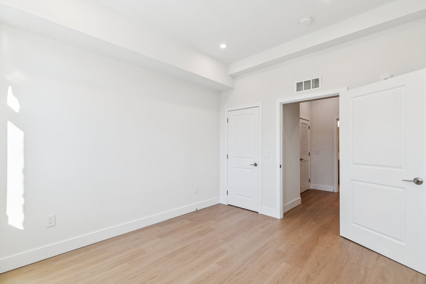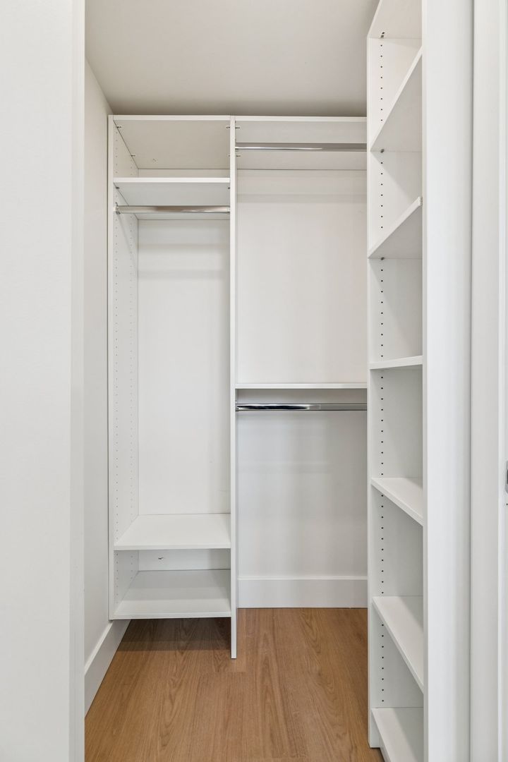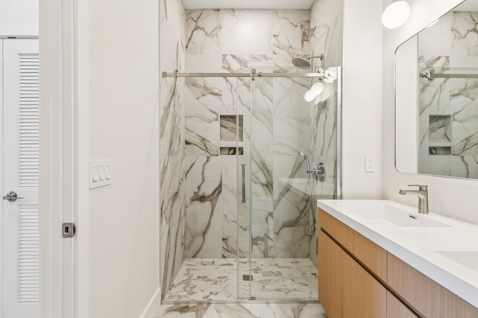 The bedroom suite features a custom closet and a luxurious private bath with Calacatta Gold-veined tile finishes, a brushed natural oak toned double vanity and spacious standing shower. The bathroom is adorned with an overhead showerhead and handheld shower providing ease of use and the luxury of a spa-like rain shower.