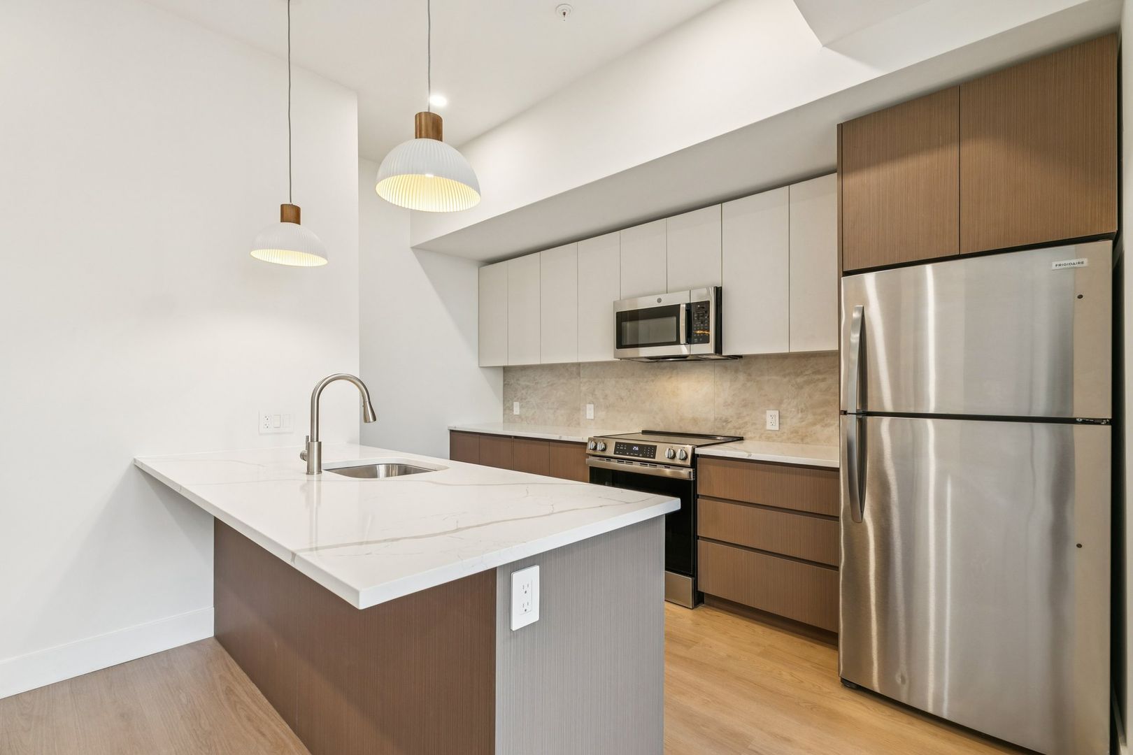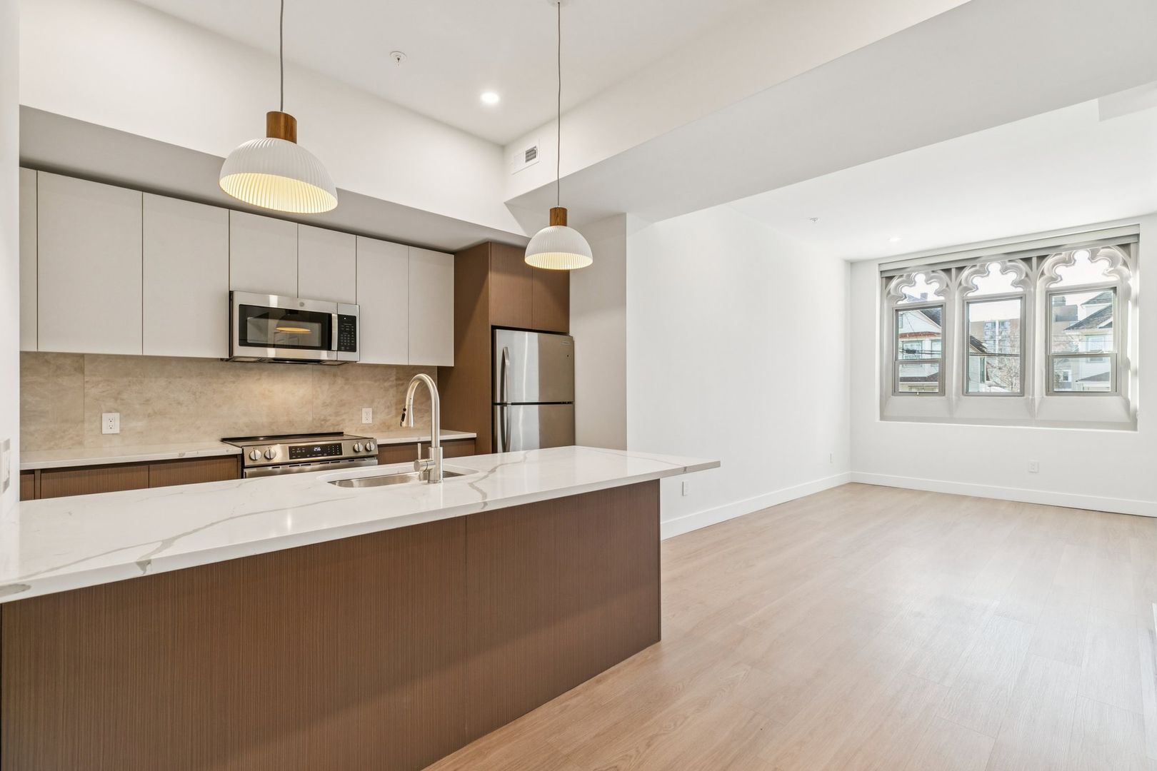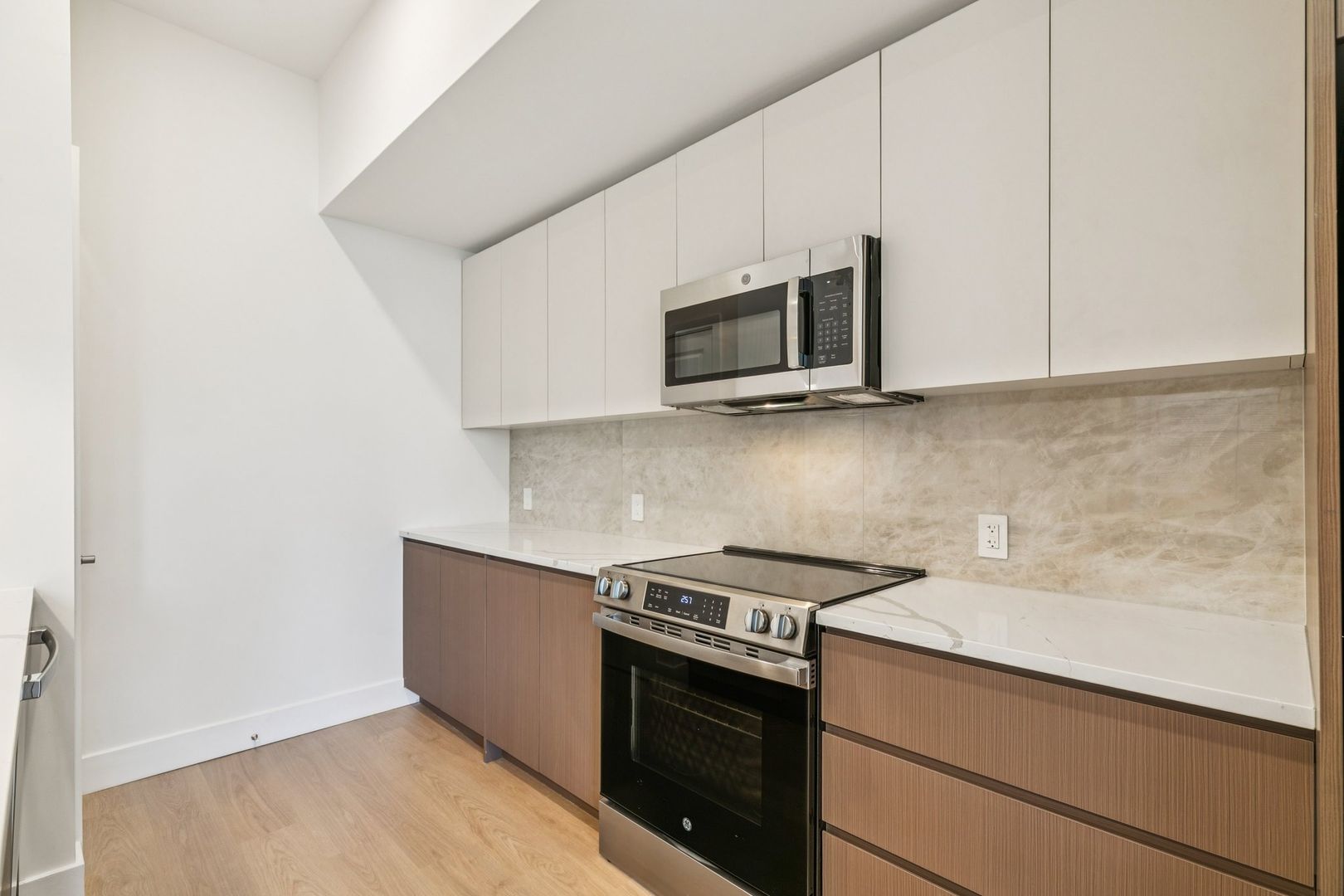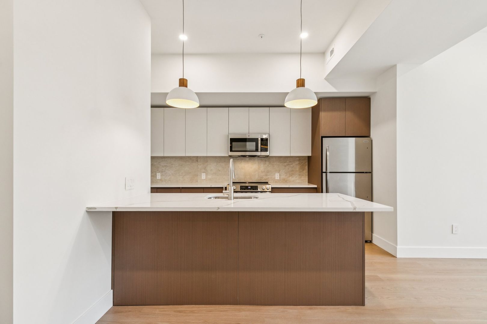 Welcome to the Monroe at The Bellmere – Be the first to reside in this newly developed one-bedroom one-bathroom residence presenting an open layout, organic finishes, and beautifully sunlit interiors. With its curated design and tailored finishes, the residence delivers timeless two-tone walnut and ivory kitchen cabinetry and a seven-foot kitchen island lined with Pilazzo Gold quartz countertops. The kitchen showcases stainless-steel appliances, a pantry closet for additional storage needs, and opens into a large living room with architectural and grand windows.
