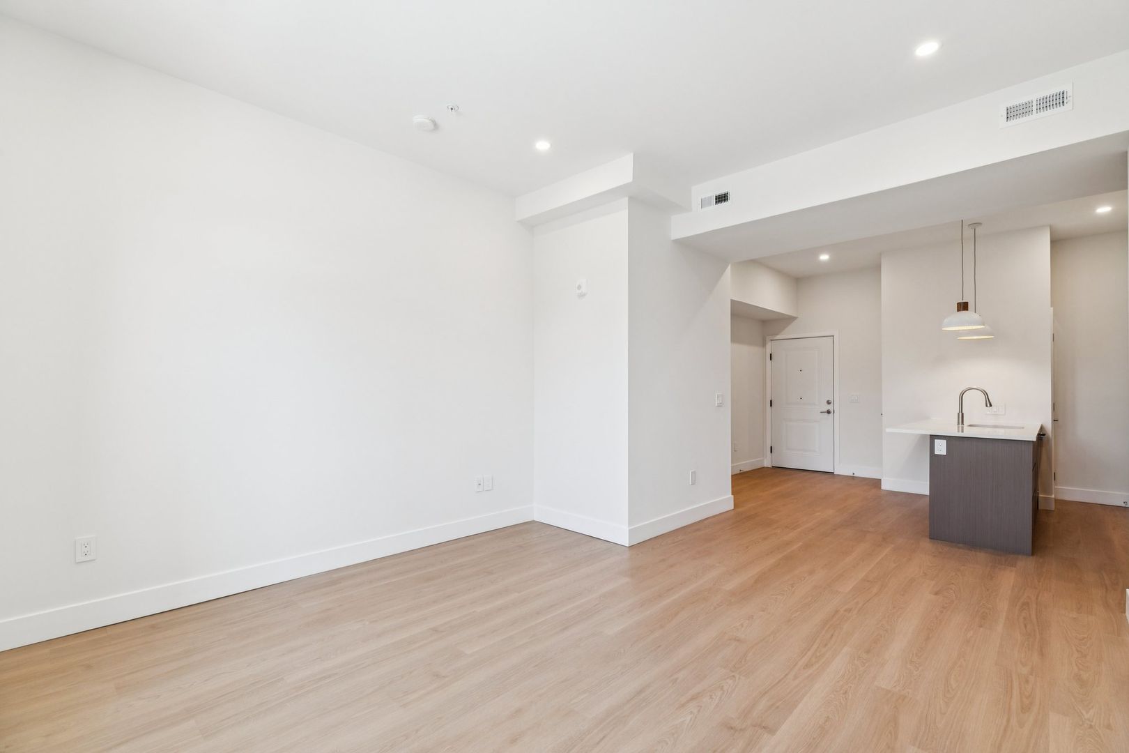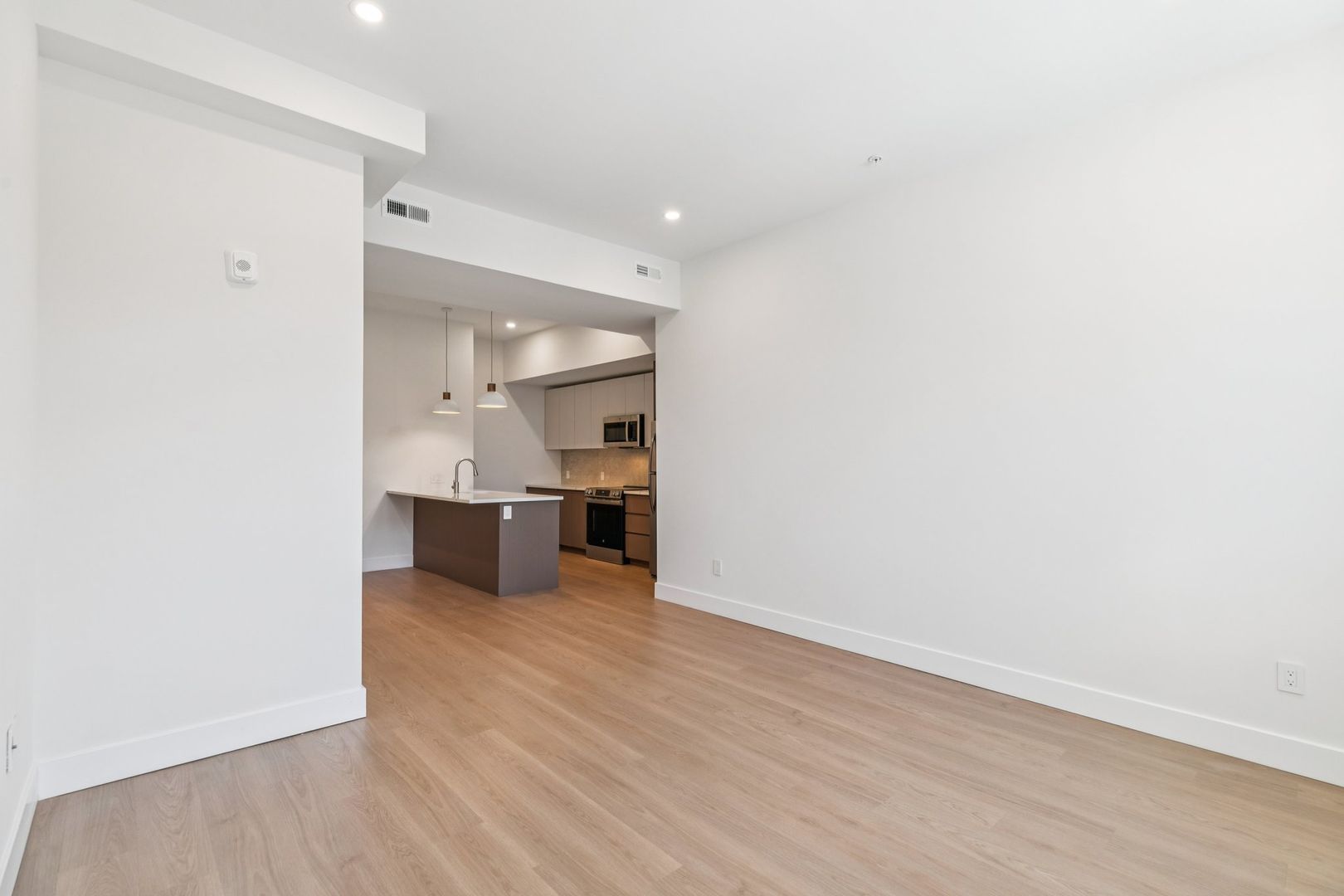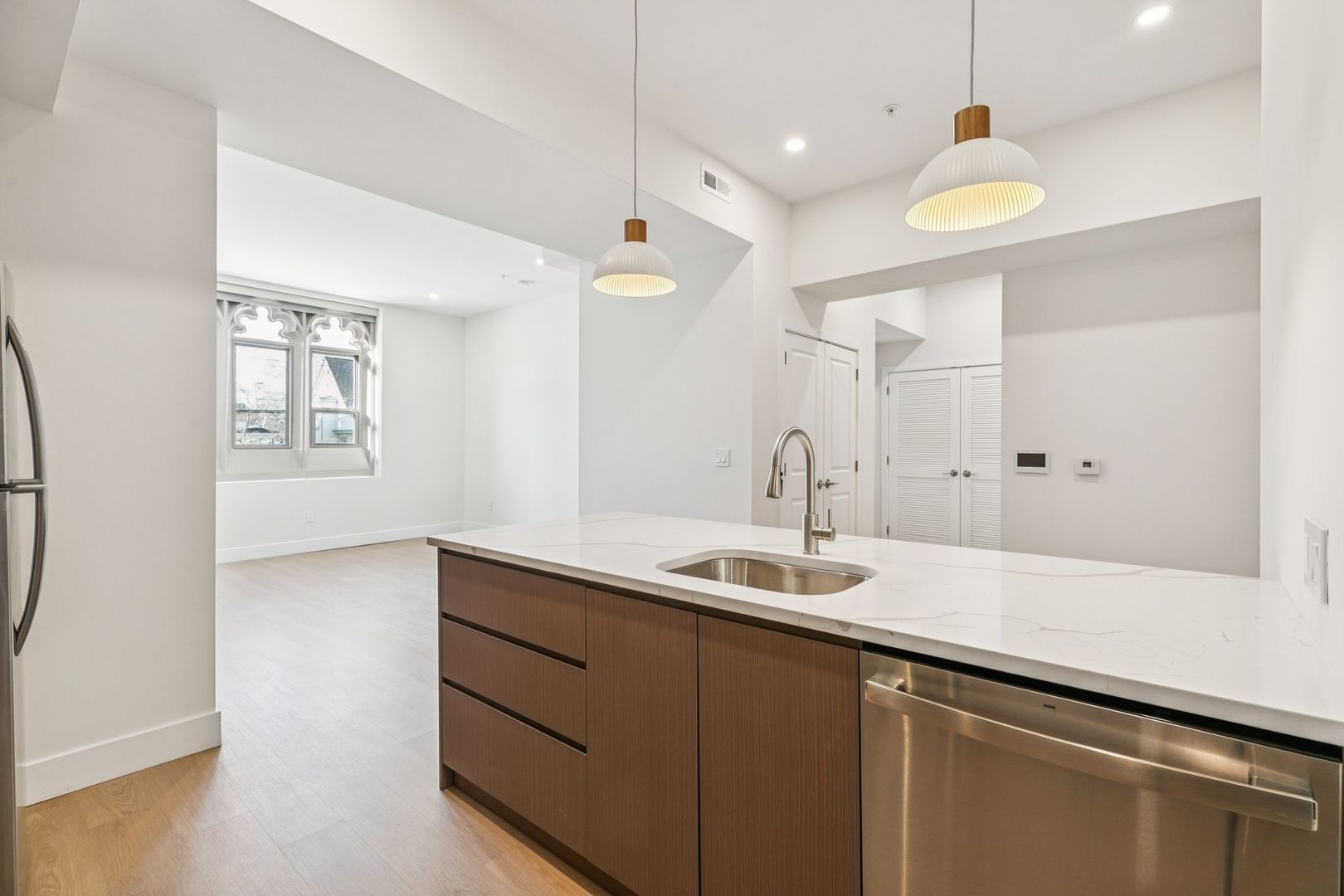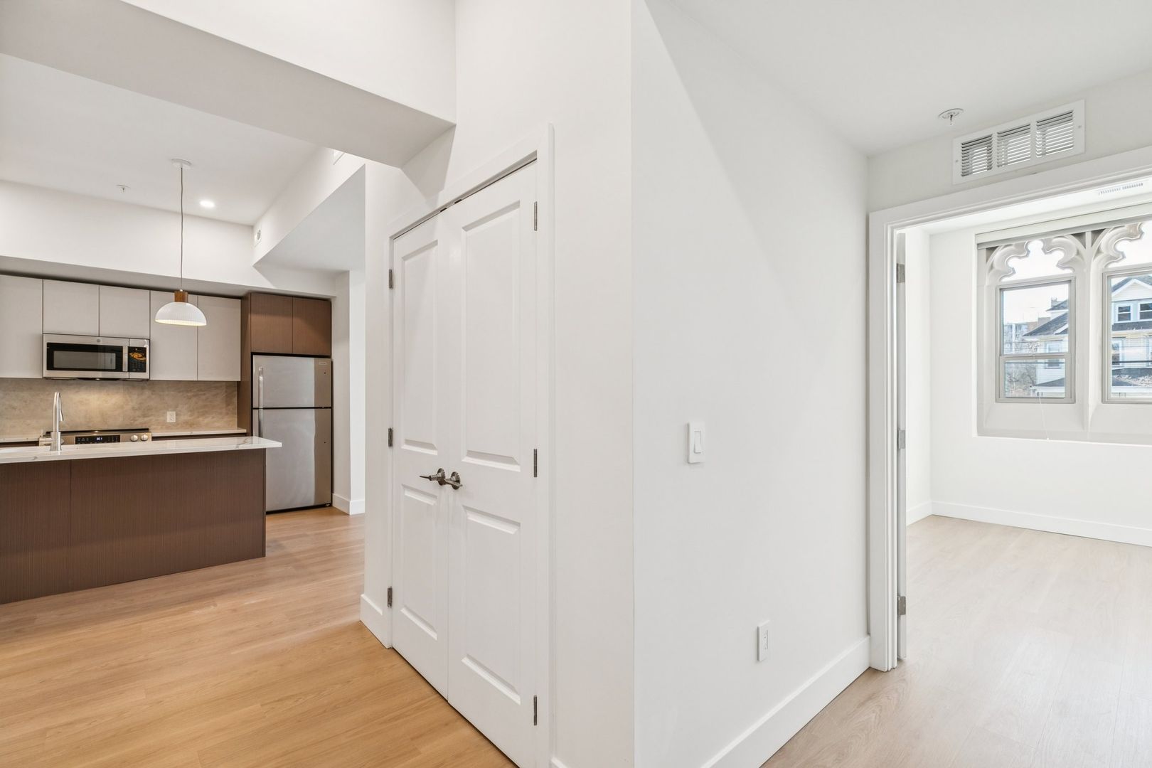 Welcome to the Monroe at The Bellmere – Be the first to reside in this newly developed one-bedroom one-bathroom residence presenting an open layout, organic finishes, and beautifully sunlit interiors. With its curated design and tailored finishes, the residence delivers timeless two-tone walnut and ivory kitchen cabinetry and a seven-foot kitchen island lined with Pilazzo Gold quartz countertops. The kitchen showcases stainless-steel appliances, a pantry closet for additional storage needs, and opens into a large living room with architectural and grand windows.